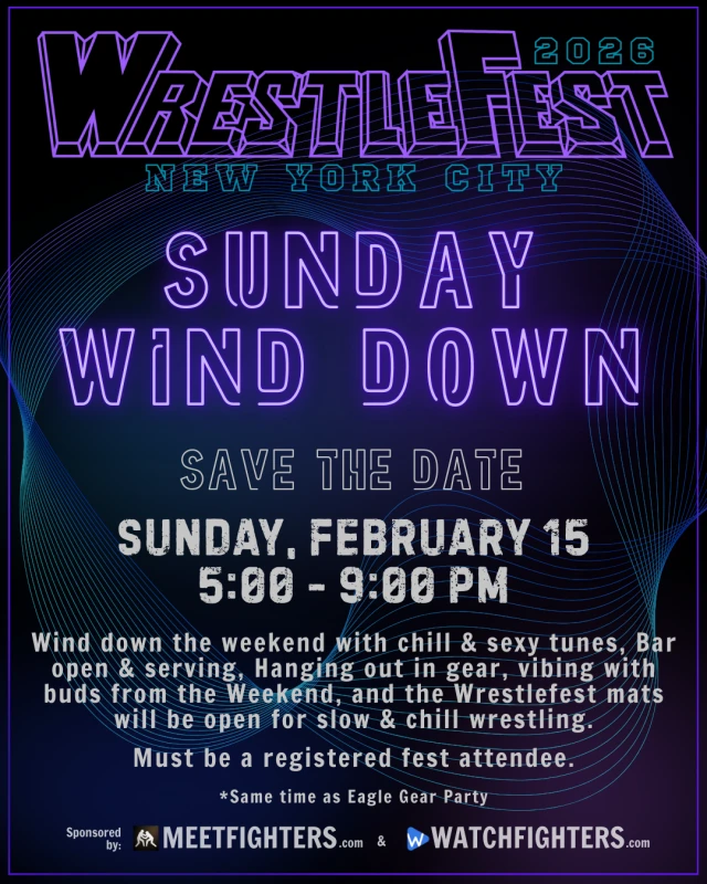 Wind down the weekend with chill & sexy tunes. Bar open & serving. Hanging out in gear, vibing with buds from the weekend, and the Wrestlefest mats will be open for slow & chill wrestling.